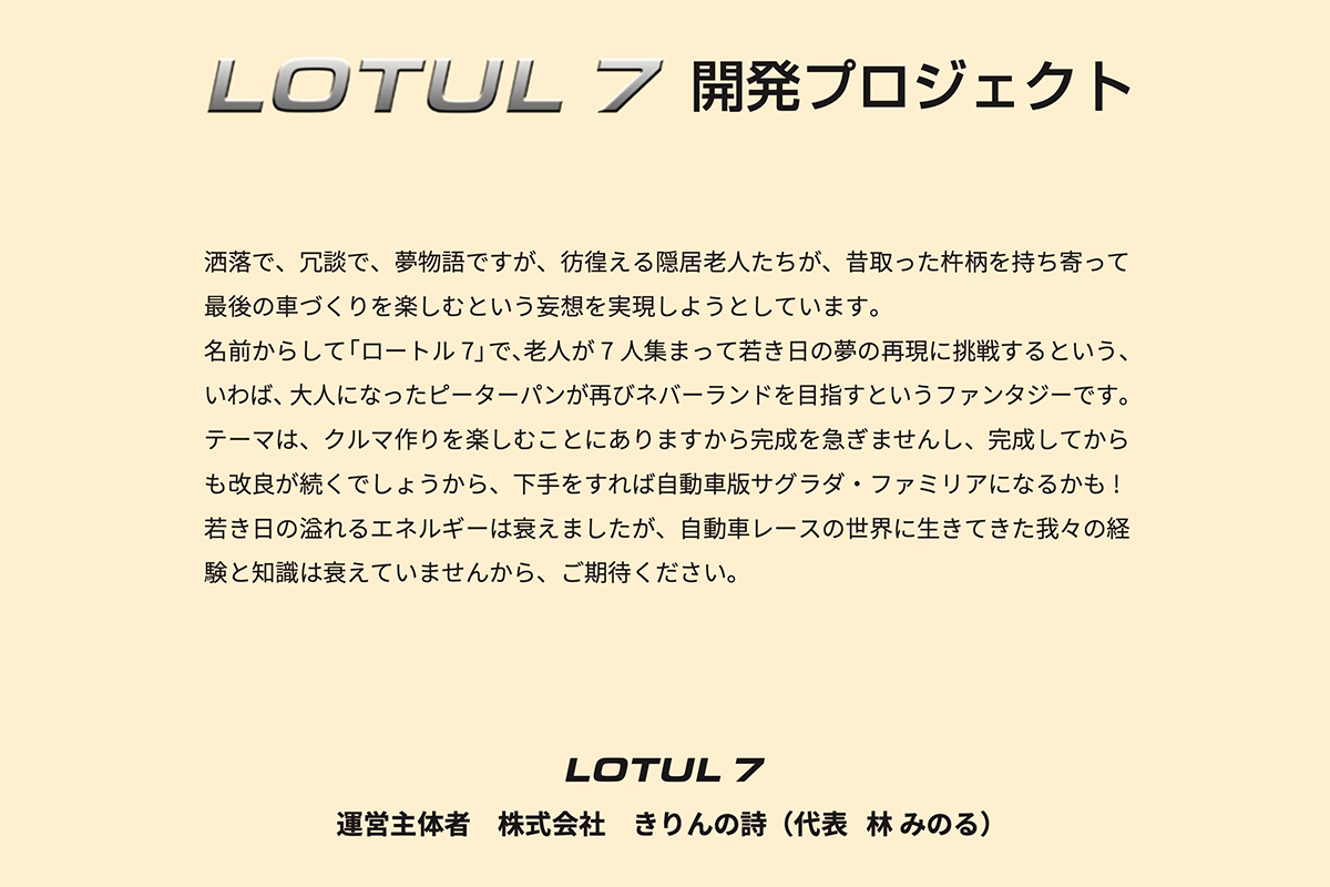 日本を代表するレーシング・コンストラクターの創始者、林みのるさんを中心に、鮒子田寛さん、松浦賢さん、解良喜久雄さん、由良拓也さん、田村千晴(元トヨタ)さん、西田典幸(元童夢)さん、そして特別顧問として木村昌夫(元無限)さんと、日本自動車界、モータースポーツ界のレジェンドが結集したロードゴーイング・スポーツカーの開発プロジェクト『LOTUL(ロートル)7』がスタートしました。