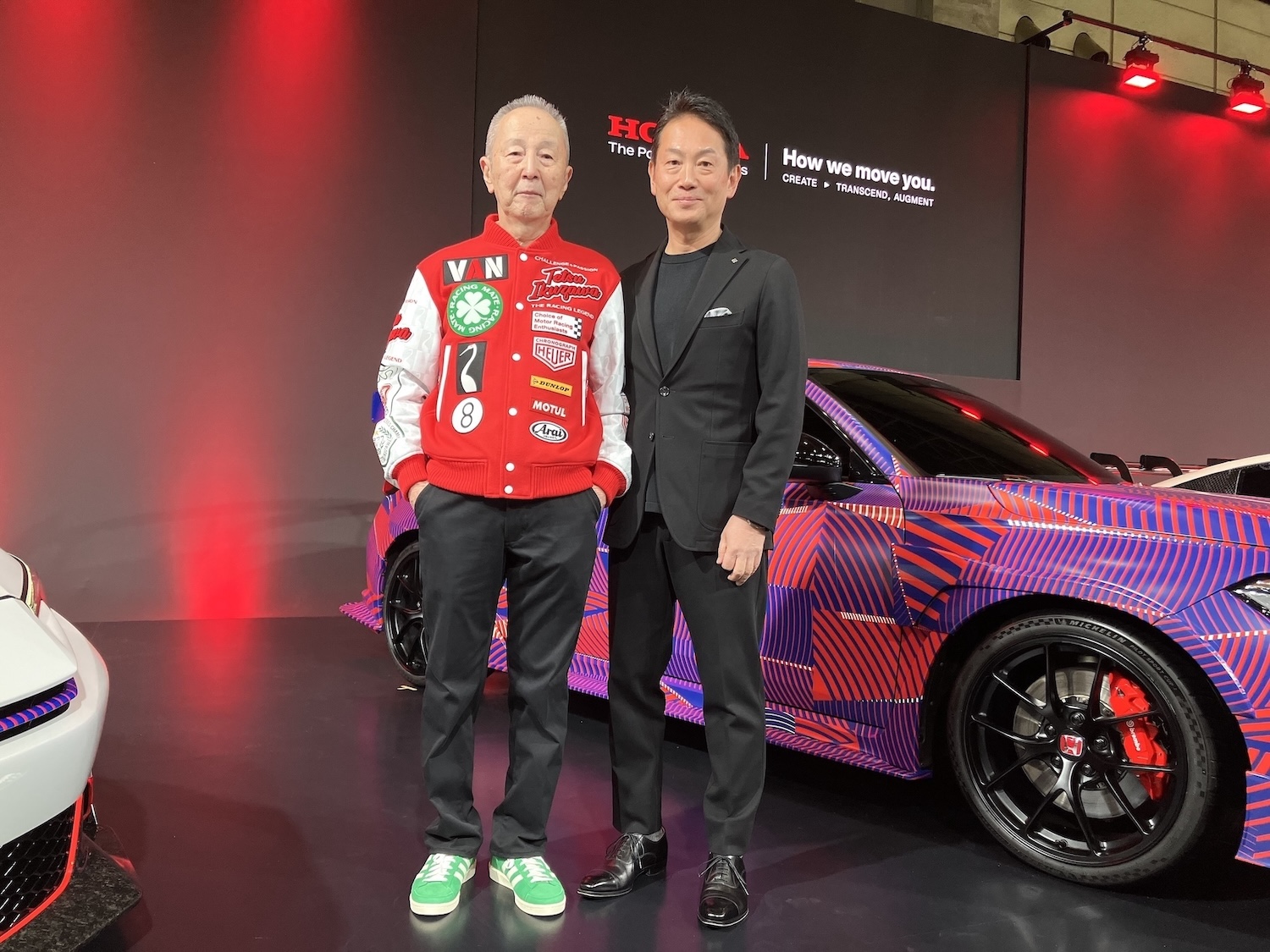 会場には生沢徹氏も登場。長年あたためてきたコンセプトを具現化したとのこと。壇上では、HRCの渡辺康治社長との記念写真に応じていました。