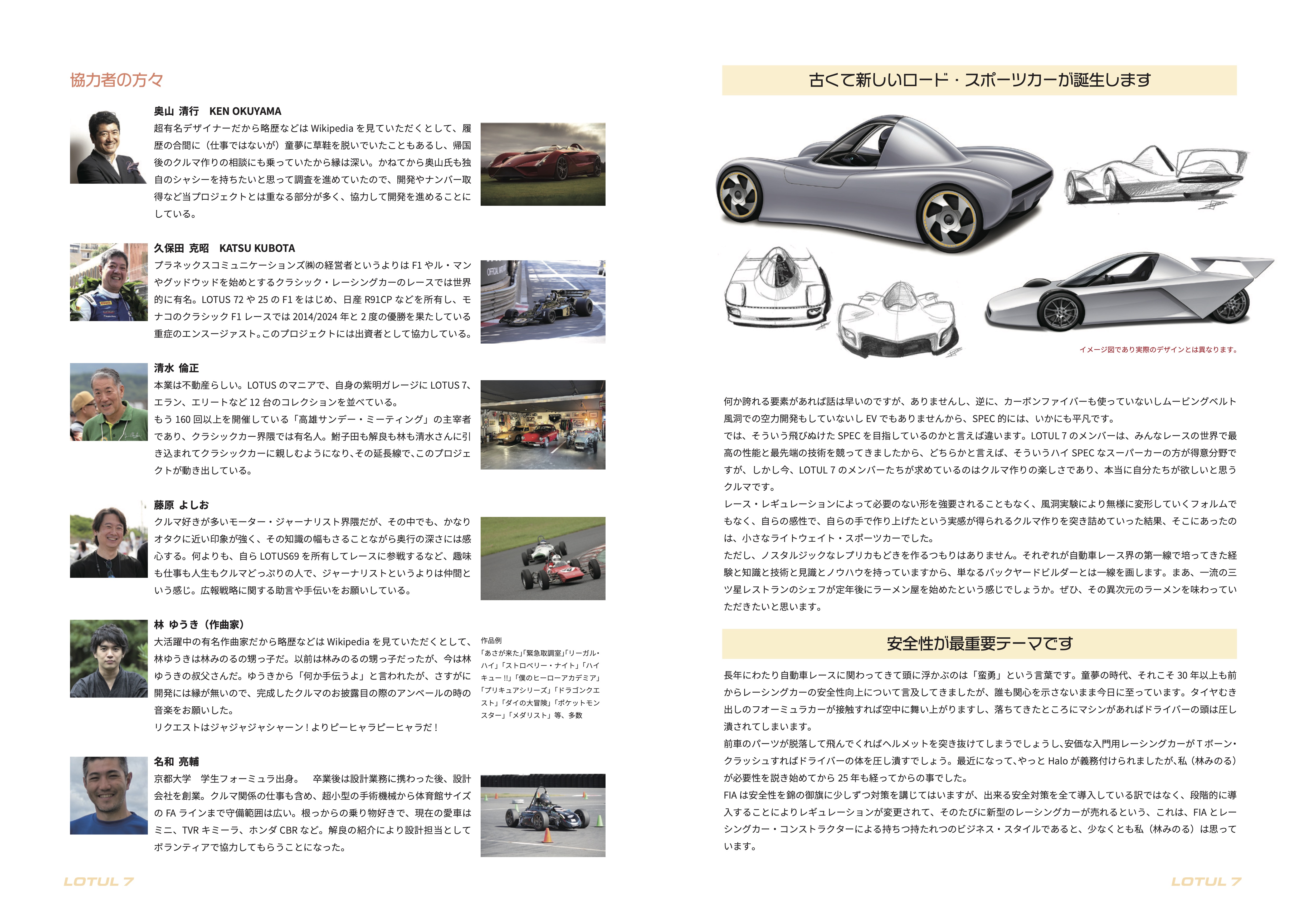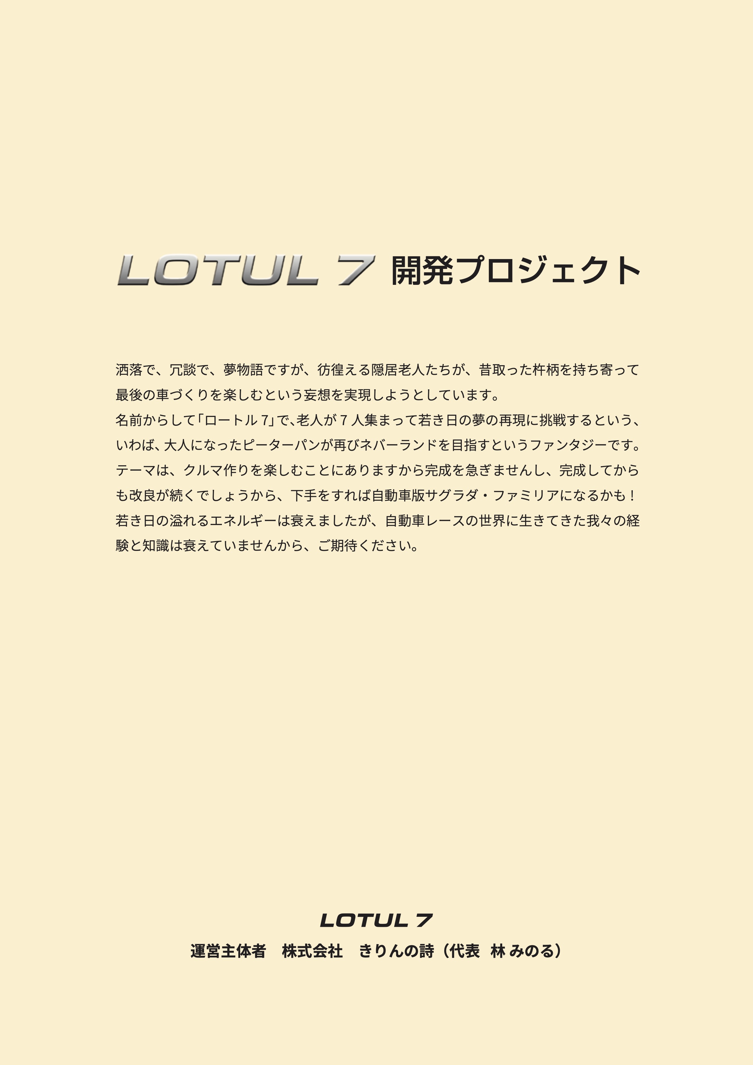 日本を代表するレーシング・コンストラクターの創始者、林みのるさんを中心に、鮒子田寛さん、松浦賢さん、解良喜久雄さん、由良拓也さん、田村千晴(元トヨタ)さん、西田典幸(元童夢)さん、そして特別顧問として木村昌夫(元無限)さんと、日本自動車界、モータースポーツ界のレジェンドが結集したロードゴーイング・スポーツカーの開発プロジェクト『LOTUL(ロートル)7』がスタートしました。